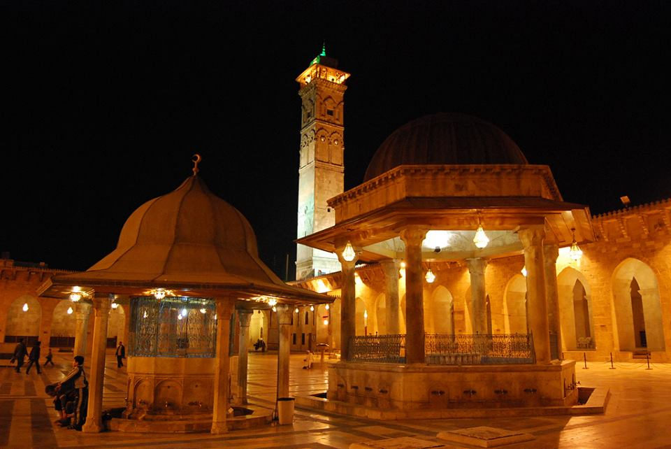أقام الخليفة الأموي سليمان بن عبد الملك الجامع الكبير في حلب على حديقة الكنيسة التي بنتها هيلانة والدة الأمبراطور قسطنطين امبراطور بيزنطة والمعروفة الآن بالمدرسة الحلوية. وتأنق في بنائه ليضاهي الجامع الاموي الكبير في دمشق الذي بناه أخوه الوليد. ولكن خلافة سليمان لم تكن طويلة 97-99هـ /715-717م ومن المرجّح أن الوليد بن عبد الملك الذي حكم من 705-715 م وابتدأ ببنائه في حياته وأكمله أخوه سليمان بعده وهذا يعني أن المسجد أنشىء خلال عامي 92-99 هـ / 710-716م.