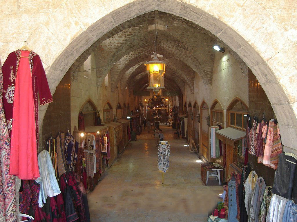 اليدوي، والنسيج اليدوي (الغل) أي رسم الزخارف المزركشة بواسطة المكوك الصغير، والحفر والنقش على النحاس والخشب، والبسط، والمصنوعات الفضية، والمنمنمات الإسلامية، والألبسة الشعبية والفرو والعباءات الحمراء ، والفخار, وفي الخان ثلاثة مرافق هي كافتيريا الباحة وكافتيريا السطح ومطعم السطح المشرف على القلعة. وقد تم افتتاح السوق في عام 1990م.