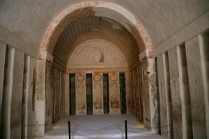 درجه من الحجر، والباب مؤلف من درفتين تزنان 3 طن. فوق المدخل كتابات تدمرية، تشير إلى أسماء أصحابه، وإلى أنه قبر تجاري. مخططه على شكل (T) مقلوبة، جدرانه مطلية بالجص، في أجنحته الثلاثة يوجد 65 من المعازب، في كل واحد خمسة رفوف أي ستة مدافن